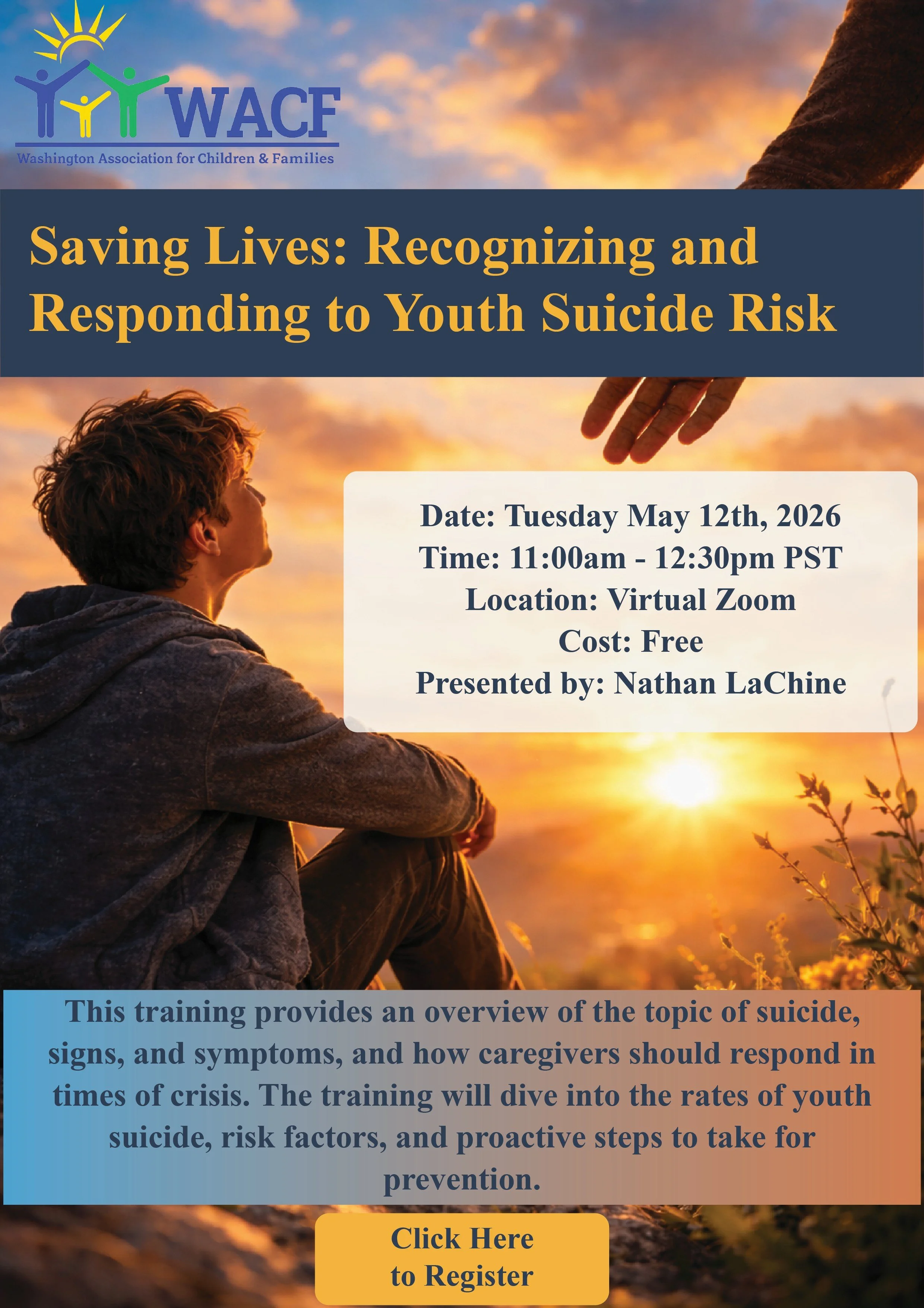 This training provides an overview of the topic of suicide, signs, and symptoms, and how caregivers should respond in times of crisis. The training will dive into the rates of youth suicide, risk factors, and proactive steps to take for prevention.